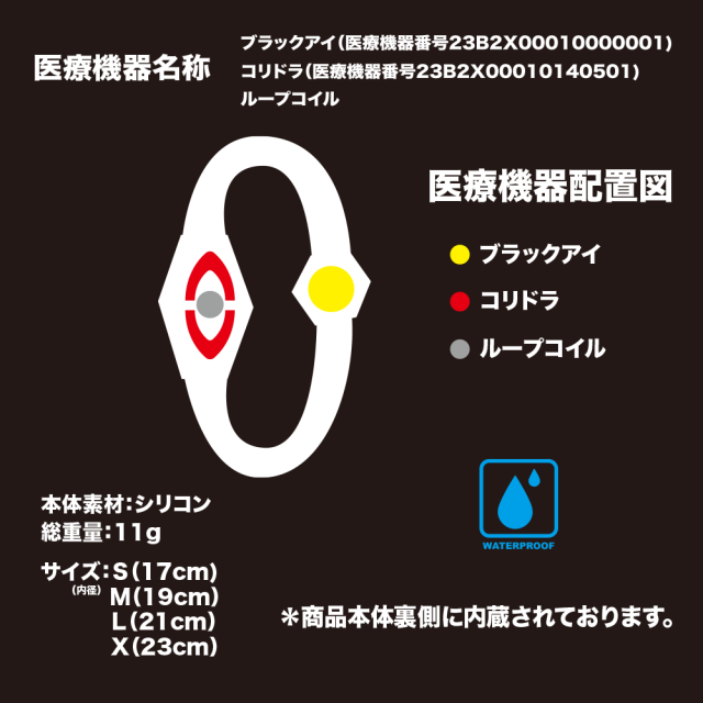 ◆本製品は医療機器「丸山式ブラックアイ」、医療機器「丸山式コリドラ」と「ループコイル」を搭載したシリコンアクセサリーです。 原材料の一部に酸化鉄及び金を使用しています。 金属やシリコン製品がお肌に合わない方は使用をご遠慮ください。